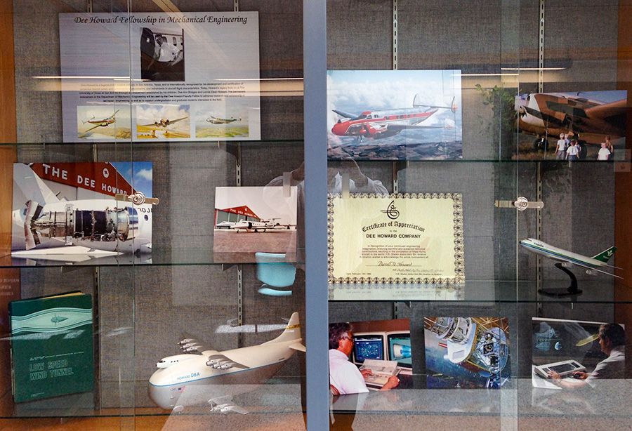 Lower left corner is a model of an aircraft designed by Dee Howard in response to an RFP from NASA for the transport of rockets. Next to the model is a wind tunnel test analysis report by LTV for the design.