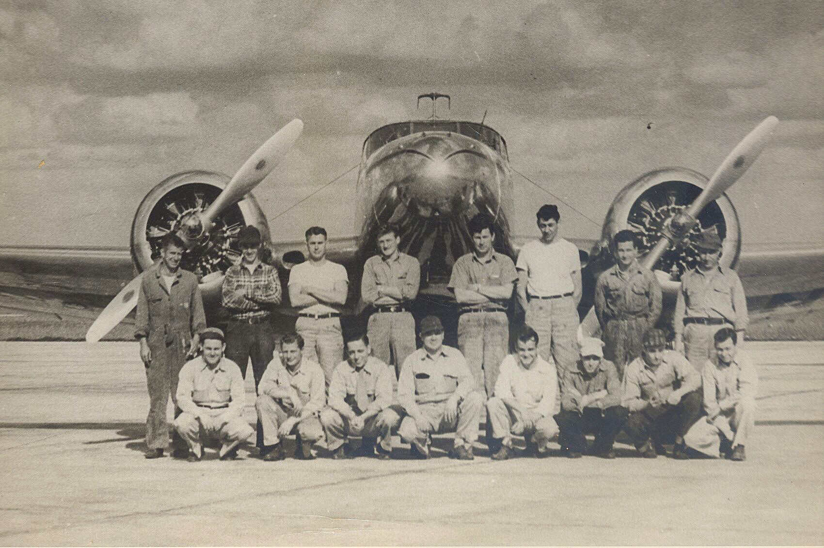 (left) The early days at Howard Aero, Inc. the aircraft is on the ramp at San Antonio Airport (now San Antonio International Airport) Dee is knelling in the middle with the baseball cap on and Ed Swearingen is knelling to the right as you are looking at the photo;
