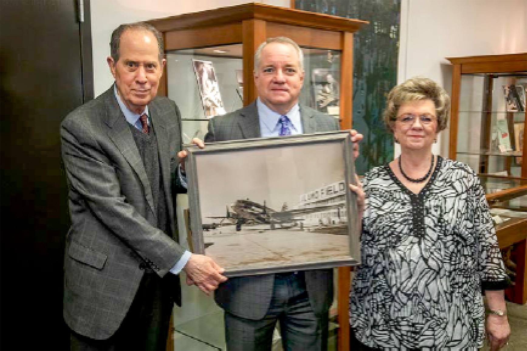 Pictured (left to right) are Chair Wayne I. Fagan (Dee Howard International Education Foundation), President and CEO Adam Hamilton, and Dee Ann Bridges (Board member, Dee Howard Foundation) holding the Slick Airways framed photograph in the Institute
