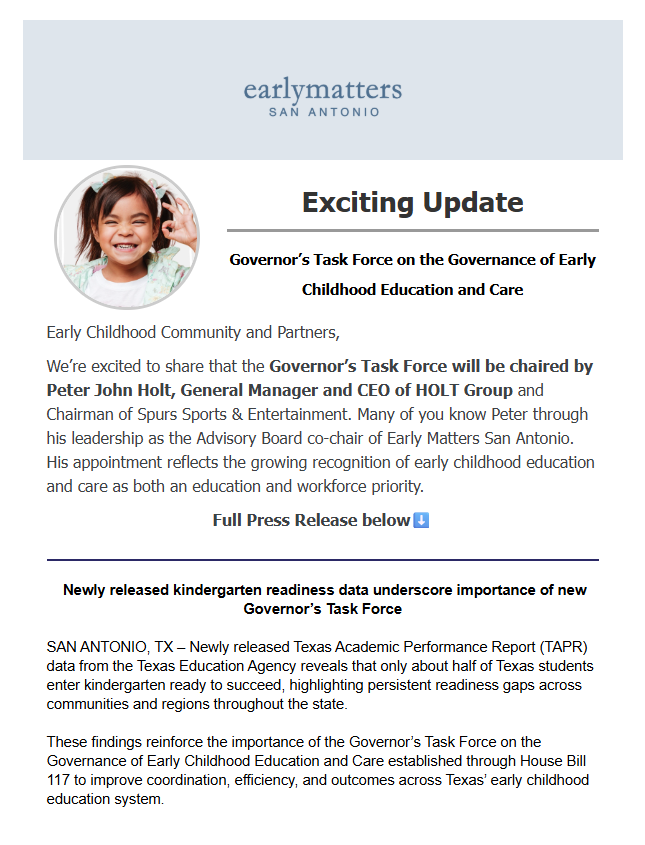 "The real reason why we passed this bill, the real reason why we're having this announcement today, is because of the importance of helping parents across the entire state be able to access quality and affordable early child care and child education for their children," said Governor Abbott. "Today I am announcing the governor's task force on early childhood education and care. The goal is to evaluate child care and early learning programs across all state agencies. We must put an end to the endless bureaucracy, the unclear standards of care, and the inflated costs that make it difficult for parents to get the early childhood care and education that they need for their children."